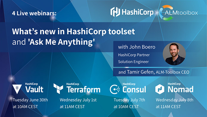 We’d like to invite you to a live webinars series (4 webinars) about HashiCorp toolset – 4 live sessions of “Ask Me Anything” and introducing the latest news about each product. Each webinar will be 50 minutes and cover one of the following tools: Vault, Terraform, Consul and Nomad.