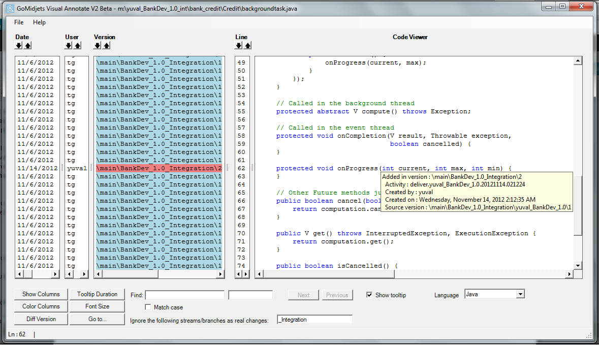 Figure 2: See line no. 62 – you can see it was inserted in version \BankDev_1.0_Integration\2 on 11/14/2012 (click to enlarge) Special offer until 12/31/2012: 3 + 1