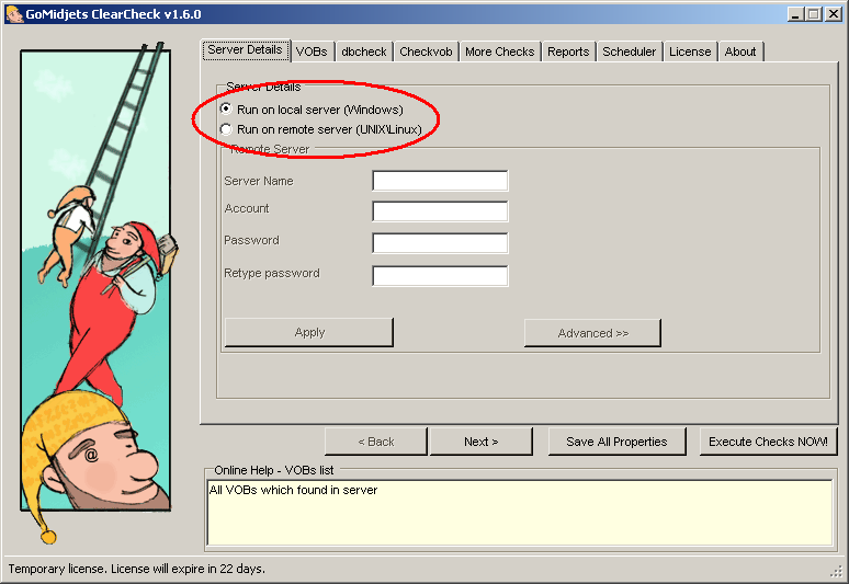 1. Select your VOB server access: local (for Windows server) or remote (for Linux or UNIX) server. In case of remote server, please enter hostname, account name that can access VOBs, password, press “apply”