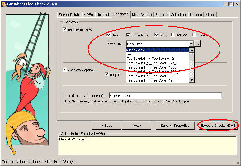 3. Select a view tag (ClearCheck automatically recognizes all views) to be a view-context for “checkvob” test.