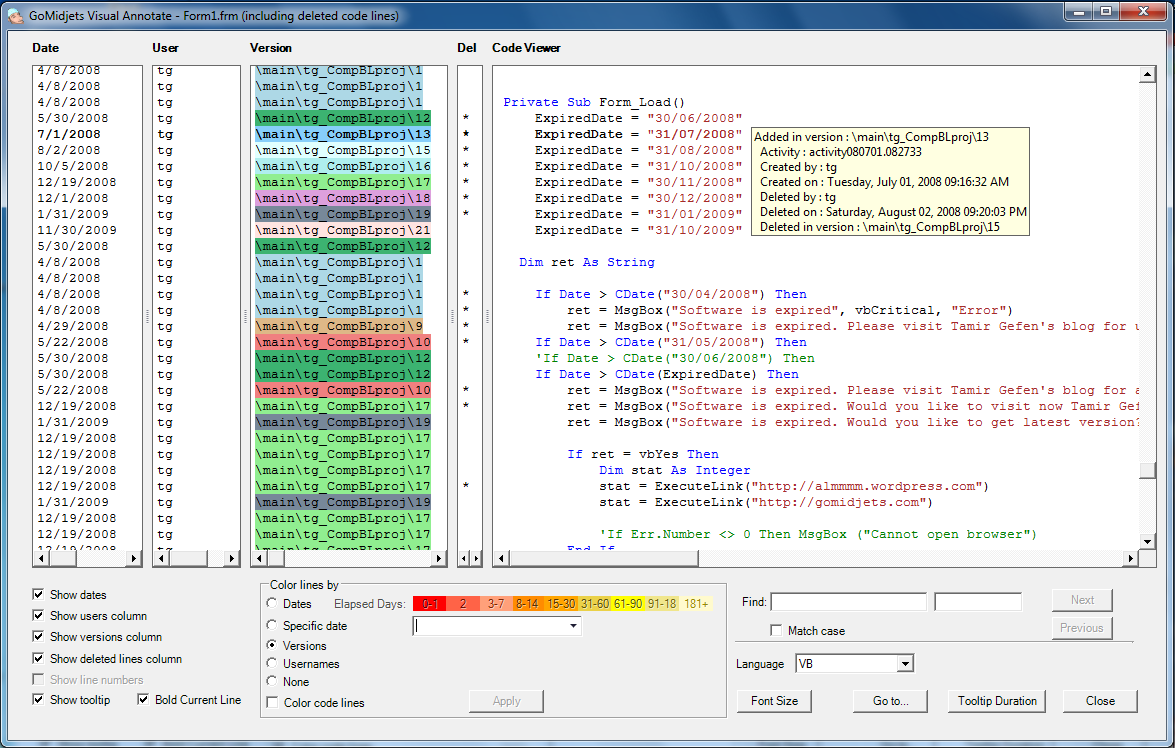 This new tool, GoMidjets Visual Annotate, helps you trace the source of defects more easily by color coding the source code lines. For each code line, you can get more information such as:
