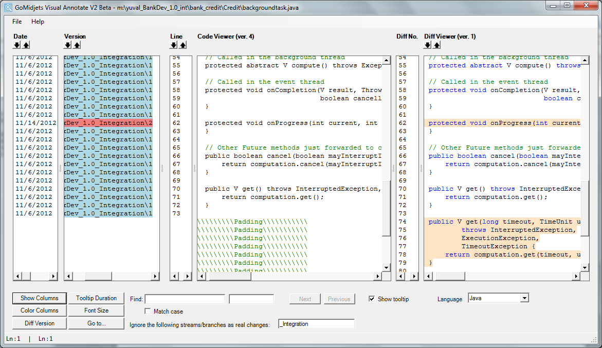 Figure 2: See line no. 62 – you can see it was inserted in version \BankDev_1.0_Integration\2 on 11/14/2012 (click to enlarge) Special offer until 12/31/2012: 3 + 1