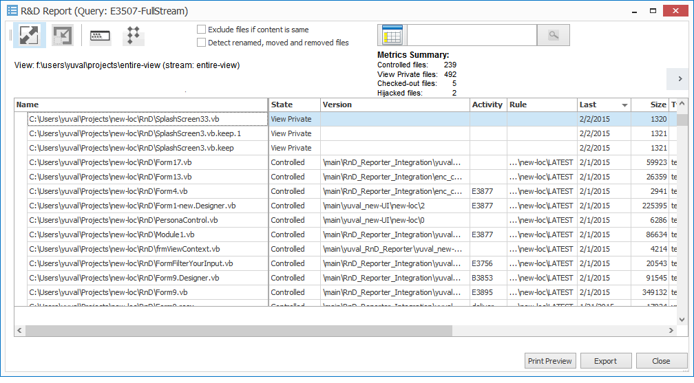 This new report provides extended capabilities far beyond just providing the data like in ClearCase Explorer and ClearTeam Explorer. These new features include displaying more data (e.g. comments; source and target versions; lines of code; related UCM activity, labels and ClearQuest record ID); filters (such as filtering out bulk of files by a given filename or extension), metrics, charts, analytics, automation and an extended context menu.