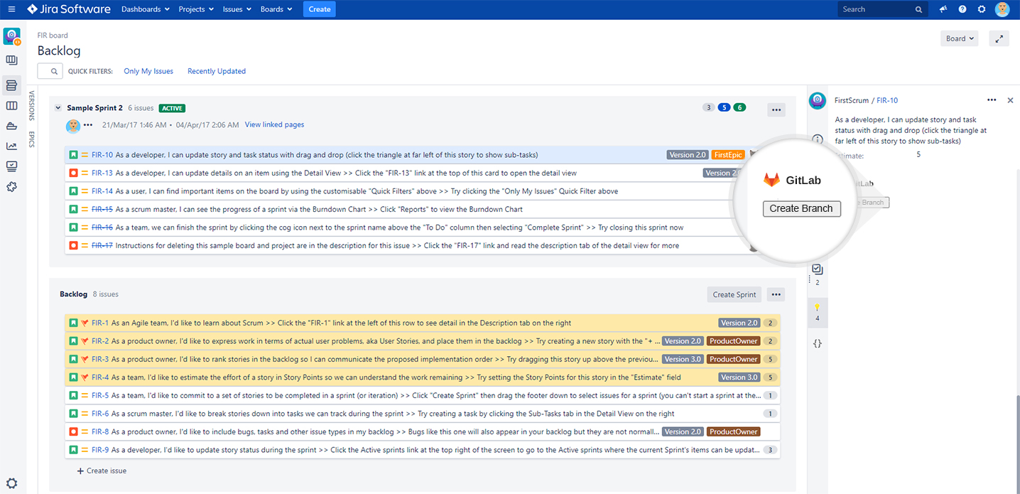 However many developers would like to have yet another capability: to create a GitLab branch (actually a git branch) from within the Jira UI, so that the branch is associated with that issue.