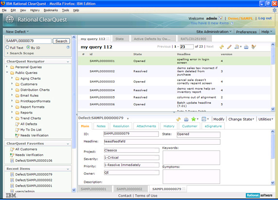Figure 8: This is the ClearQuest web dashboard, including the common queries on the left panel. ALM Performance immediately alerts if users can’t run these queries.