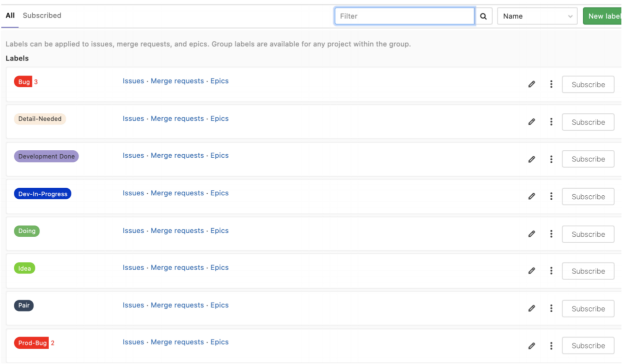 ניתן לבנות board שמותאם בדיוק לצרכים שלי – וזה הפיצ'ר האהוב עלי ב- GitLab . אפשר למשל להגדיר board בשם "Development", ואז מוסיפים לו labels באופן כזה שכל אחד מסמל סטטוס פיתוח / בדיקות, ולאחר מכן מוסיפים אליו issues . למשל: