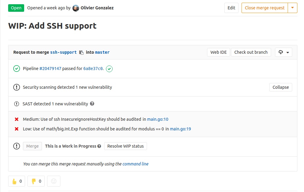 הריצה למעשה היא חלק מתהליך ה- CI והתוצאות נראות בתוך ה- Merge Request (כך שאין צורך "לזפזפ" בין כמה כלים) – הנה דוגמא: