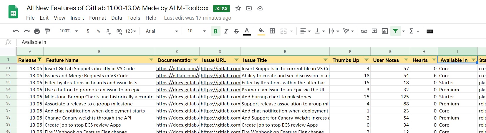 2. רשימה מלאה של כל הפיצ'רים הקיימים ב- GitLab (כולל 13.6) – מסודרים לפי editions. הואיל ויש למעלה מ- 470 כאלה, סידרנו זאת באקסל, לפי editions וקריטריונים נוספים – הכל בקובץ המצורף