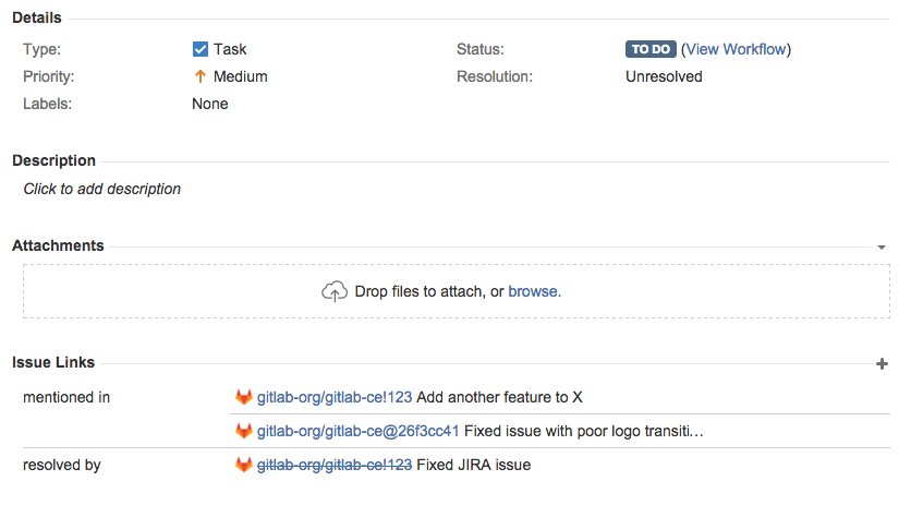 תוספת חדשה היא קישור מ- JIRA ל- GitLab, כאשר מזכירים JIRA issue בתיאור של commit או בתיאור ב- merge request. כאשר זה קורה, יתווסף לינק בטופס ה- JIRA (בחלק התחתון של Issue Links) שמאפשר להבין את הקישור ל- commit (ומעצם היותו לינק מאפשר גם לפתוח אותו בקלות). הנה דוגמא: