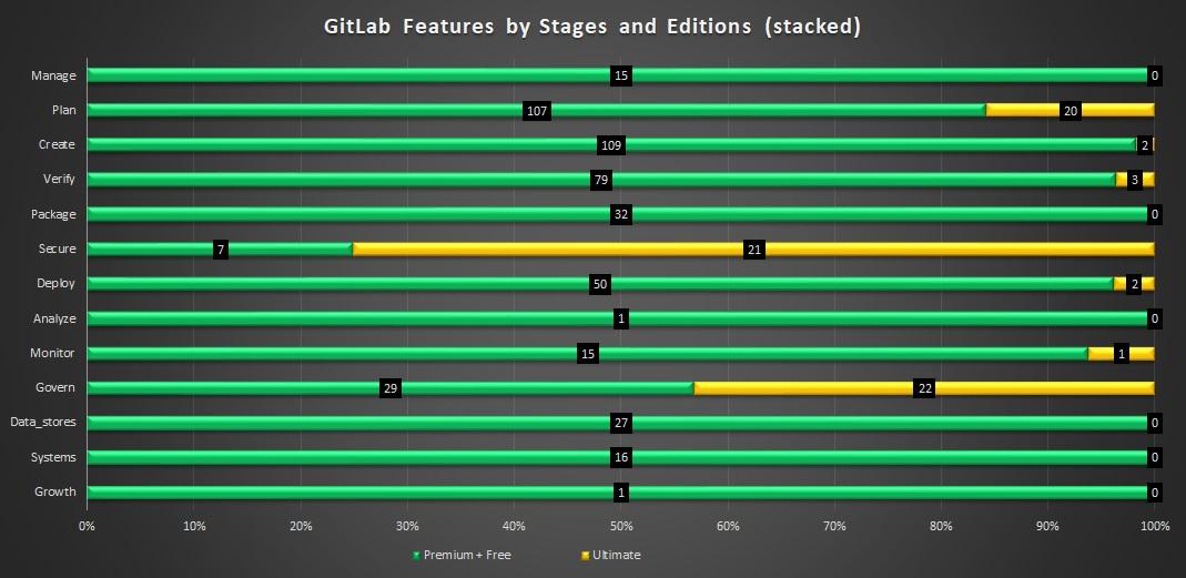 • ניתן גם לראות שבממוצע כ- 87% מהפיצ'רים שיש סה"כ ב- GitLab , קיימים ב- Free + Premium .