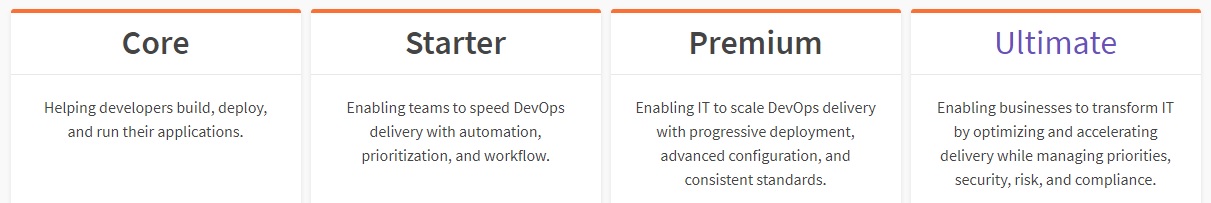 אם רוצים להשתמש ב- GitLab על שרתי החברה או על ענן פרטי (שתי האפשרויות הן למעשה on-premises או כפי שגם נקרא לעתים self-hosted / self-managed) – נותר כעת לבחור מבין הגירסא החינמית (Core – השמאלית ביותר בתמונה), גירסת Starter או גירסאות Premium ו- Ultimate. ההבדלים העיקריים הם: