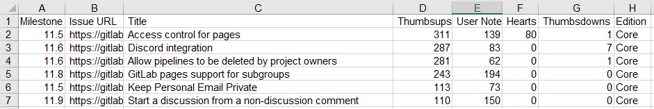איך זיהינו את הפיצ'רים המבוקשים ביותר? ע"פ חכמת ההמונים: הואיל ולא רק הקוד פתוח ב- GitLab אלא גם כל הדיונים מסביב לפיצ'רים חדשים גם הם פתוחים – כתבנו סקריפט שסורק את הפיצ'רים החדשים שנוספו בחודשים האחרונים (באמצעות סריקת ה- repo המתאים יחד עם שימוש ב- API ). לקחנו בחשבון גם את כמות ה- Thumbs-up (מעין "לייקים" שמשתמשים מוסיפים לצד כל פיצ'ר) , לצד כמות ההערות (User Notes) ומידעים נוספים. ריכזנו הכל אוטומטית לטבלת Excel שבנינו, מה שמאפשר לנו לשקלל את התוצאות, למיין ולפלטר ע"פ כמה פרמטרים.