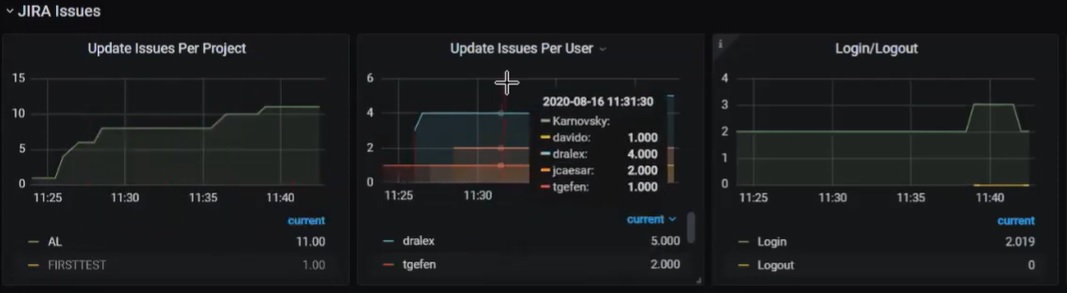 החלטנו גם לנטר זאת בצורה ויזואלית משולבת מדדים מספריים, משום שזה מקל על עבודת הניתוח ומאפשר לראות קורלציה של סיבה ותוצאה (למשל את הקשר בין login של משתמשים למערכת וביצוע פעולות שלהם ב- Jira לבין עומס על הזכרון, על אותו ציר זמן). הצד הויזואלי מאפשר גם "לספר את הסיפור" של השרת ; מאפשר לזהות רטרואטיבית נקודות חמקמקות שאולי פספסנו בזמן אמת, ומאפשר גם לשתף זאת בקלות עם אנשים אחרים בארגון (כגון אנשי IT או מנהלי פיתוח) ע"מ שיבינו את הממצאים ויעזרו לפתור בעיות.
