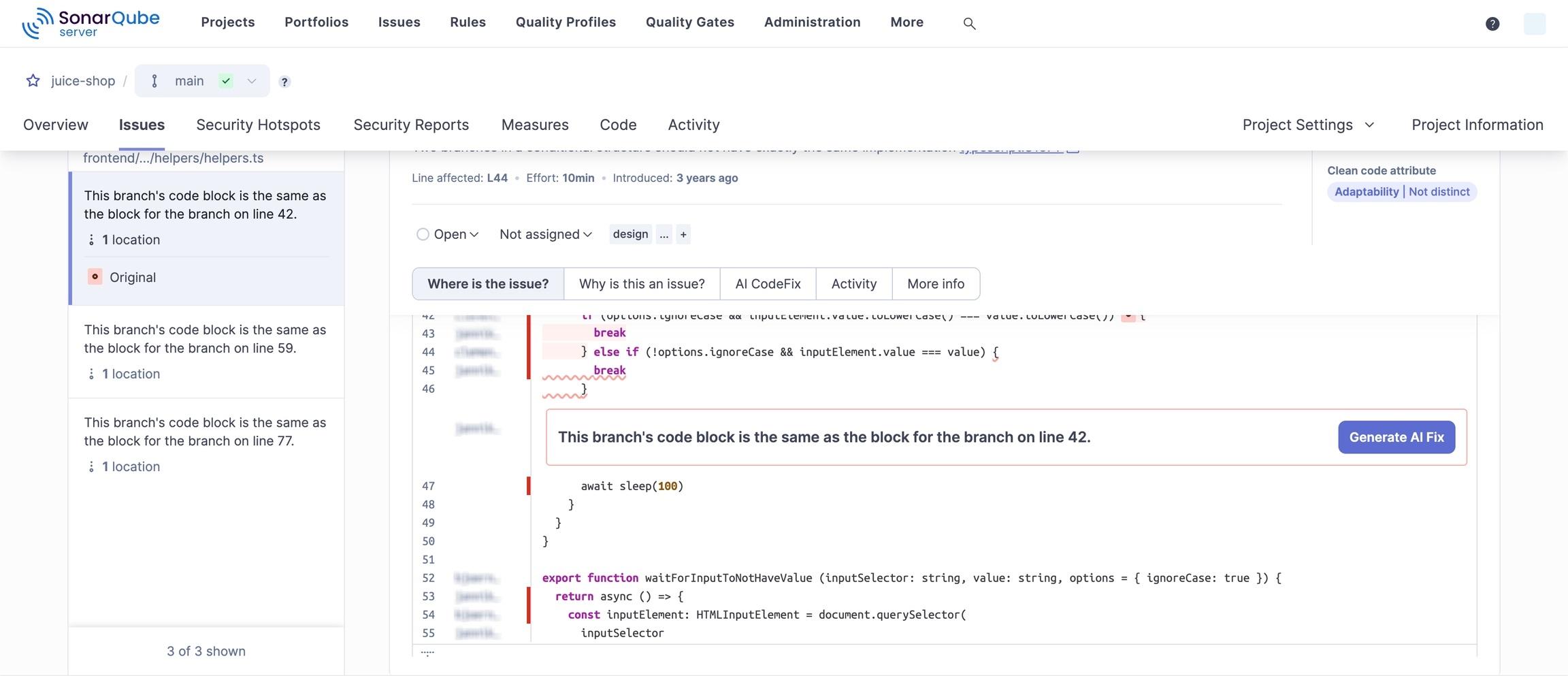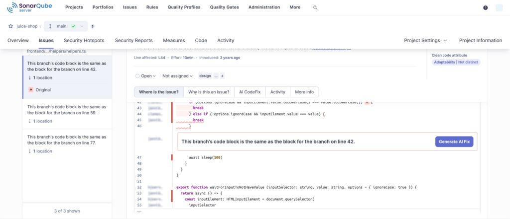 במידה ומפעילים יכולת זו, ובמידה ויש תיקון מוצע, אזי המשתמשים יראו כפתור "Generate AI Fix" לצד מסך השוואה של שורות הקוד לתיקון (Diff view) – כפי שיש בתמונה הבאה שהוספנו לדוגמא: