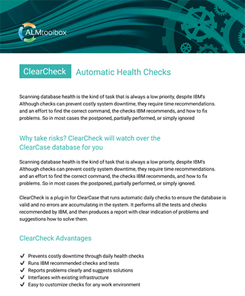 ClearCheck is very user friendly and enables ClearCase Admins to schedule dbcheck, checkvob and rgy_check easily and efficiently."