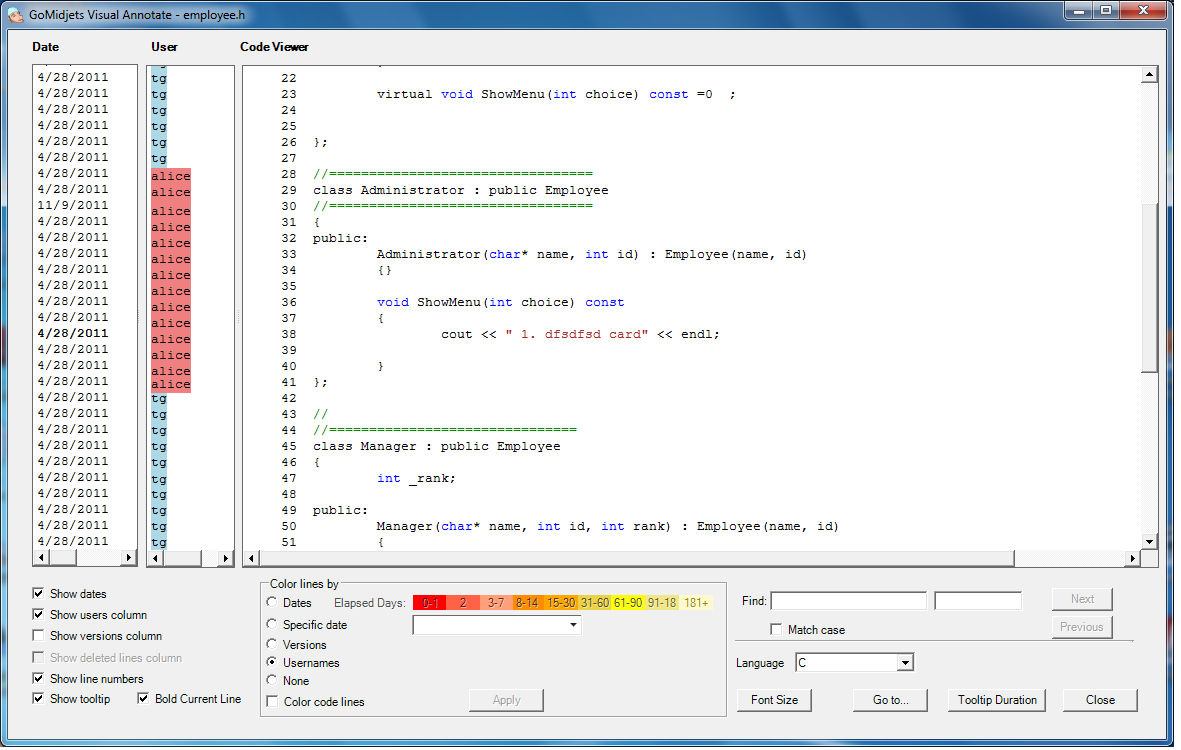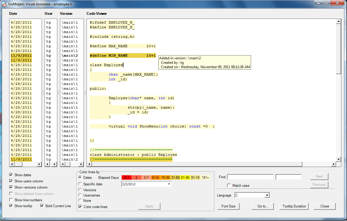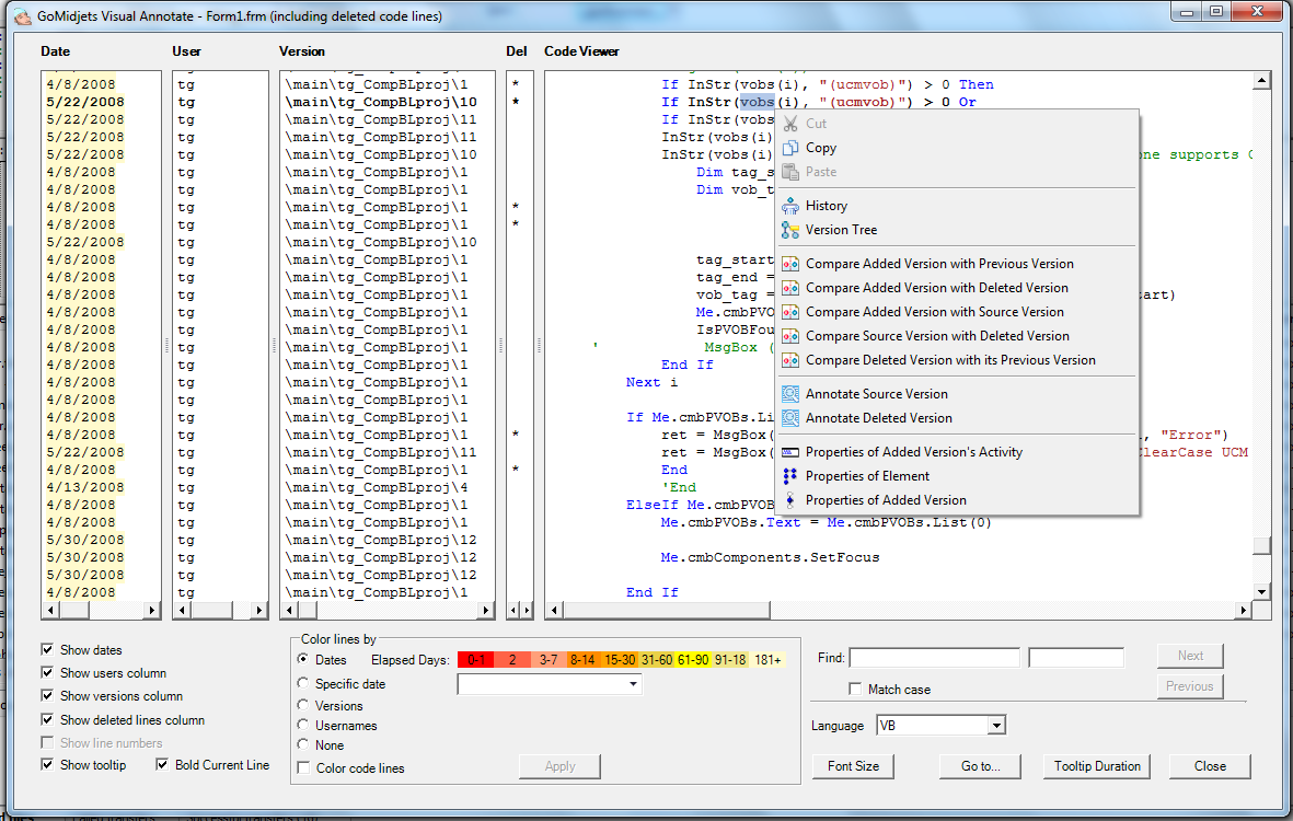 Visual Annotate provides a source code viewer that colors each code line separately, depending on the criteria that you choose: